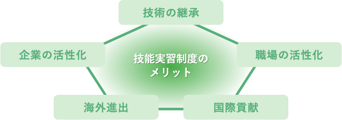海外進出の基盤づくり外国人技能実習生に企業の技術・ノウハウを伝授することで、人材育成による国際協力ができると共に、企業の海外進出時の人材・技術力の確保にもつながり、現地幹部候補として期待され、海外発展に重要な基盤づくりが可能になります。